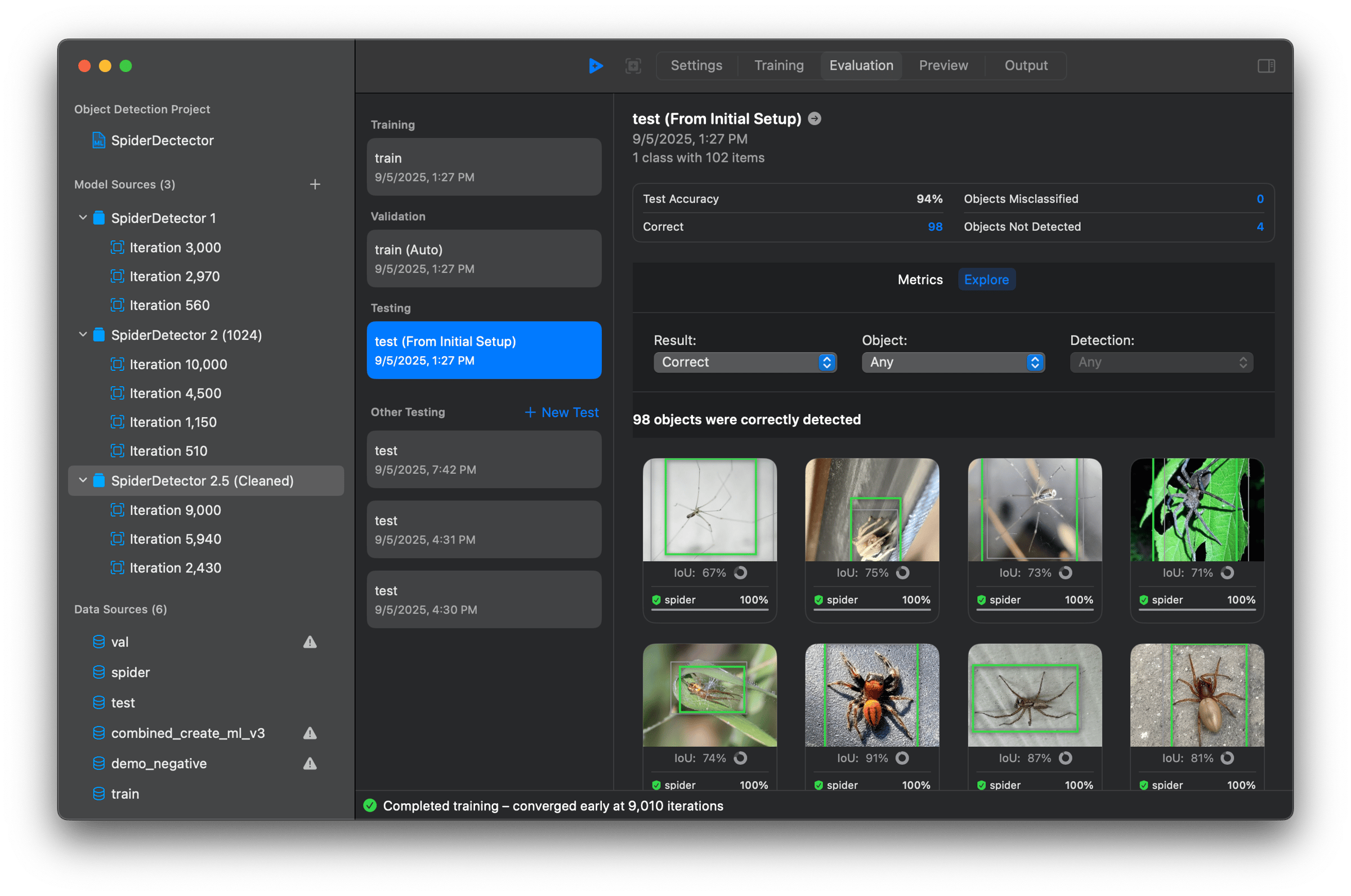 Codex is great for prototyping. It's way better than Claude Code (which is why you don't see that in the video). I used to use Claude Max, but stopped after it became super frustrating to use. (It lies about doing work or tests, so I can't trust it to finish tasks without babysitting 100%). Codex is more truthful and honest (not always, but overall). Create ML - Machine Learning Create ML is the training tool I'm using to create my initial MVP image classifiers and object detectors. It's Apple's harness for building intelligence into your apps. At some point that may change, but it's a great visual starting point. You can write your own training code in Swift when you need more control (which I imagine I'll be doing soon). In the image above you can see a simple Object Detector model I trained on 914 spider images that I annotated with RectLabel (macOS). I plan to train a new model on 10,000+ images in the near future to improve accuracy. Talk to you soon, Paul Solt |